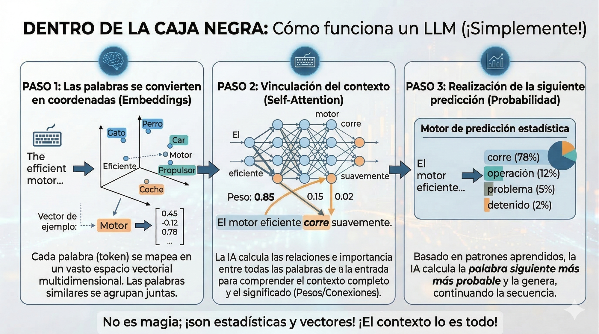 Si el modelo procesó "El motor eficiente...", revisa sus datos y dice: "Hay un 78% de probabilidad de que la palabra que siga sea funciona, un 12% de que sea opera y un 5% de que sea falla".